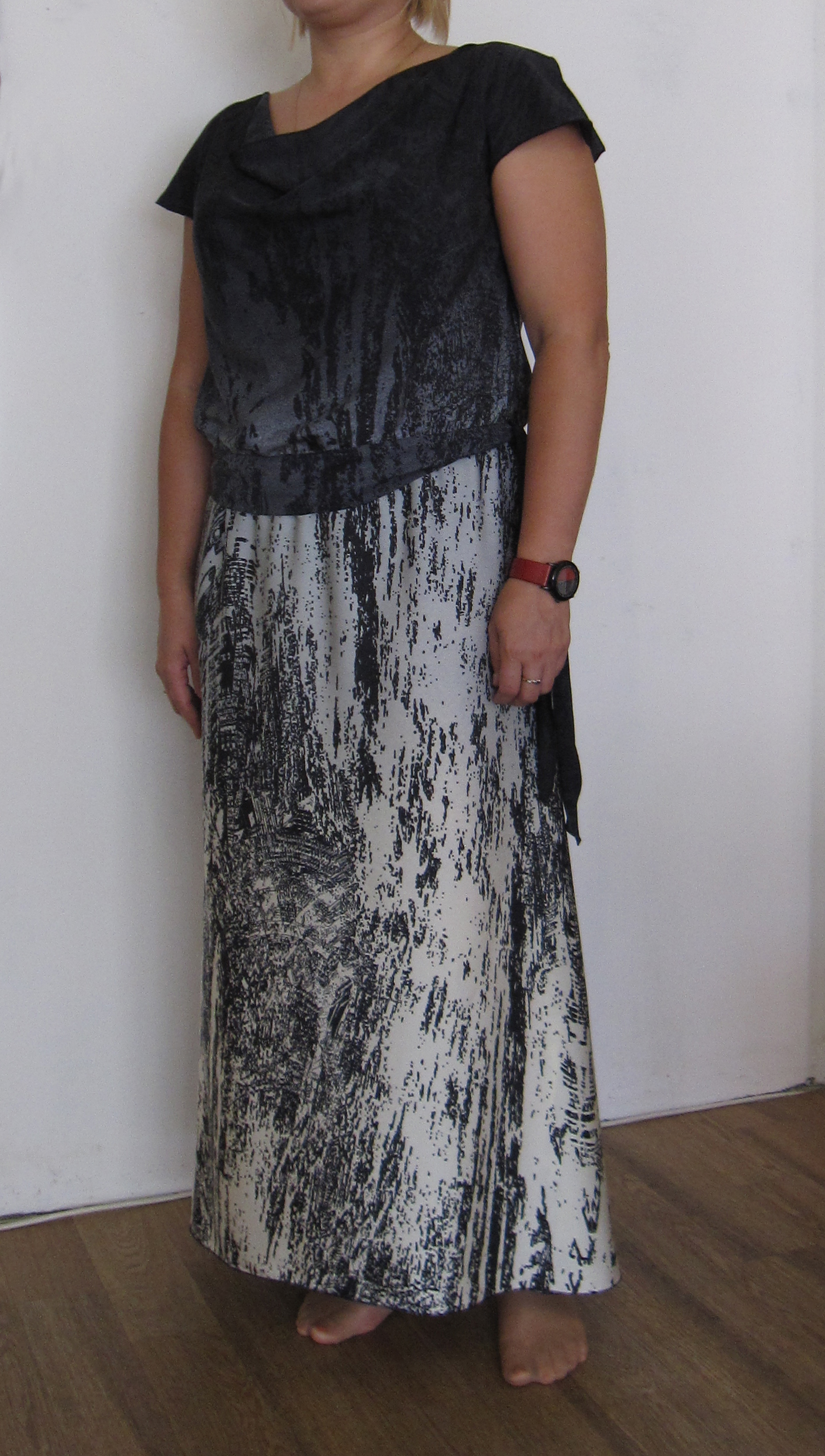 Блузка со спущенным плечом. В плечевом шве - разрез. Низ на поясе, с завязкой в левом боковом шве.