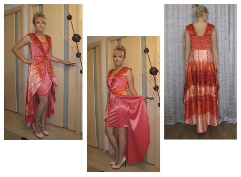 Съемная разноуровневая двухсторонняя юбка на поясе с застежкой по переду на пуговицу с декоративным бантом.