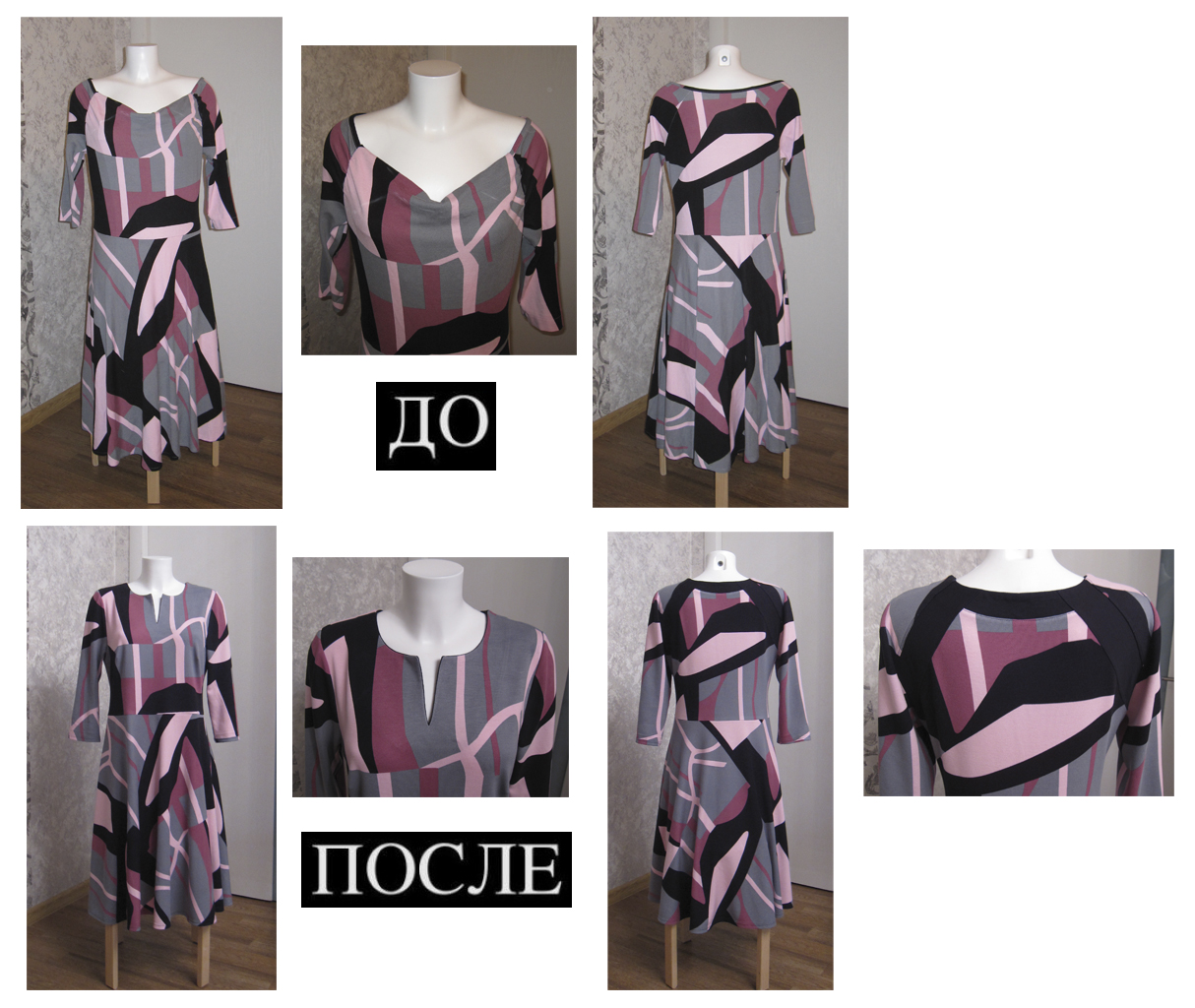 Перекрой лифа - по переду за счет излишка ткани в провисе горловины, сзади за счет вставок из черного трикотажа и кокеток из основной ткани. Лиф укорочен.